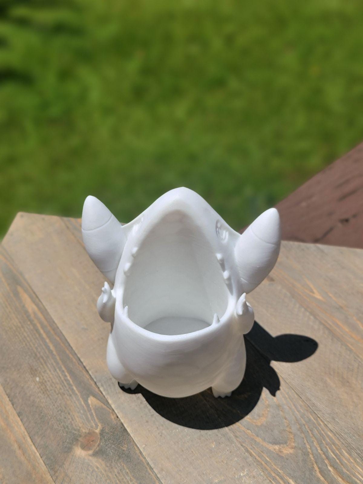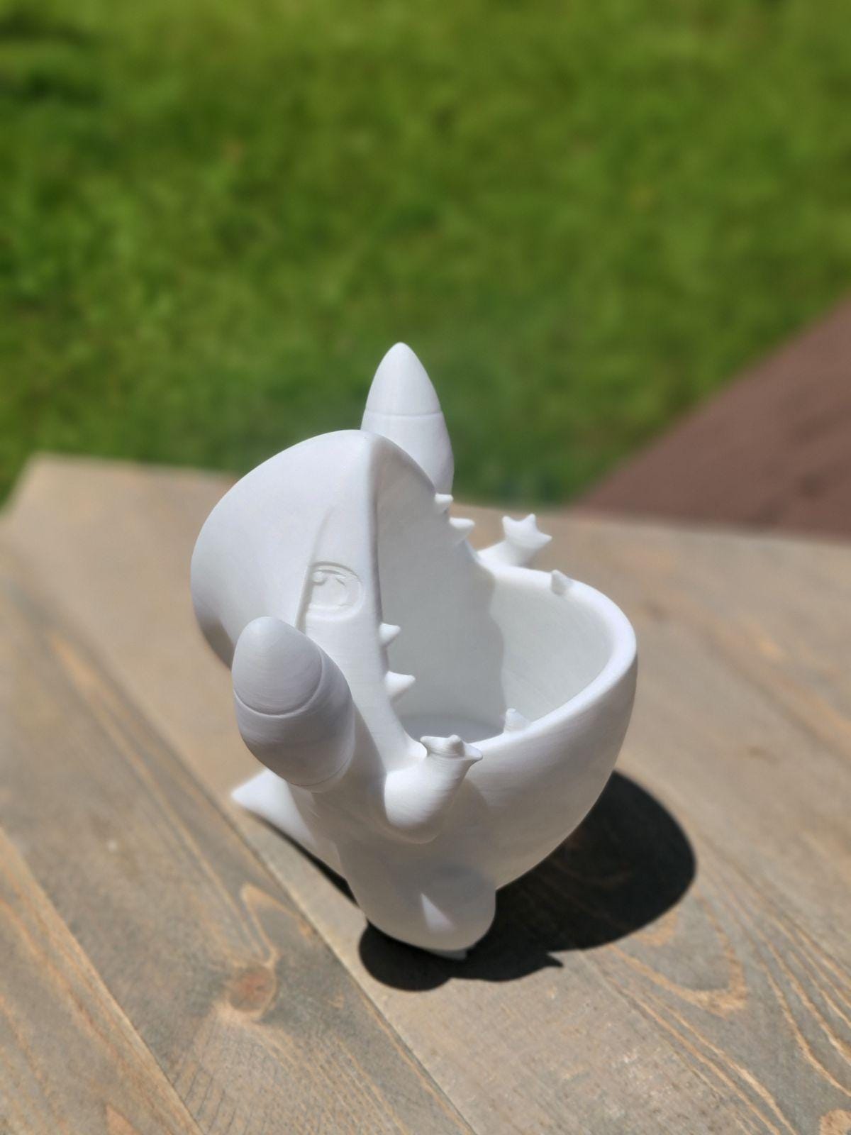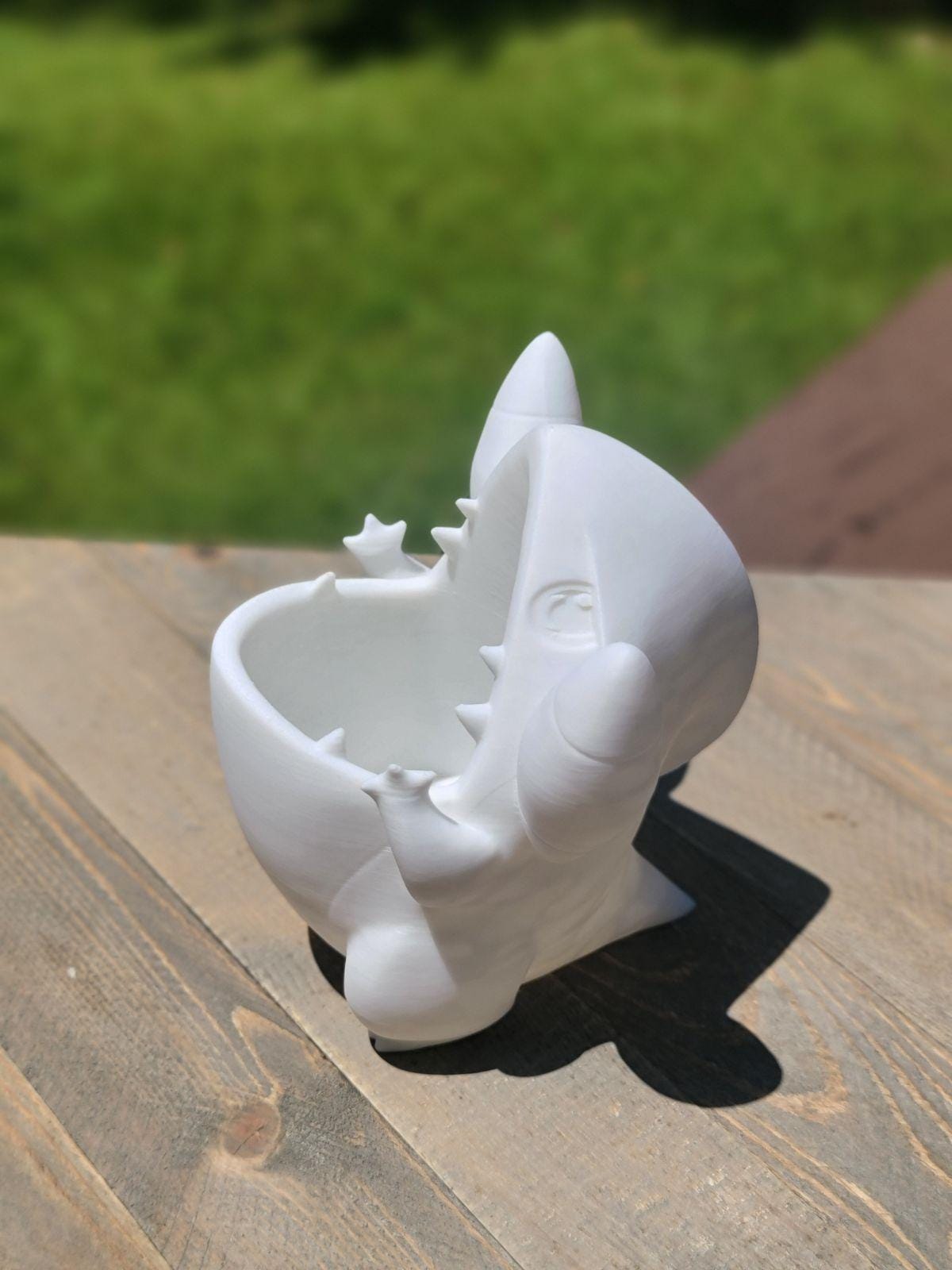 A Cute Pokemon Planter (Gible) A perfect place to keep your succulent plants. You can have it in a vast range of colors or special sizes if you need it - We also do custom orders. SIZE Hole 5 cm, Opening (approx) (2 inches), About 5 inches tall. Disclaimer: Due to the product being 3D Printed, they may contain marks which are commonly associated with the process (lines, seams and divets.)